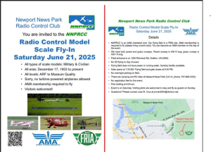 This item came to us by way of the LaRC Aviation Enthusiasts Group.  The Newport News Park Radio Control Group is holding a Radio Control Model Scale Fly-In on June 21.  The flyer is attached and there is a FaceBook page describing the event and location.  We do not know their wind limits for flying or if there were showers that day, so if the weather looks questionable you may want to check out the Facebook page for any updates, or email the contact in the flyer (Juan R. Cruz at jrcmer2004@Verizon.net).
